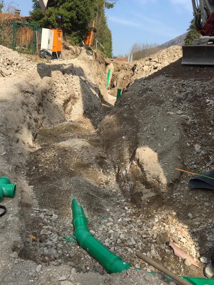 Da uns nur das schmale Zeitfenster der Faschingsferien zur Verfügung stand, mussten wir mit 2 Bagger und 2 LKW anrücken um die Bestehende Wasserleitung für den Turnhallenneubau am Gymnasium in Marquartstein umzulegen