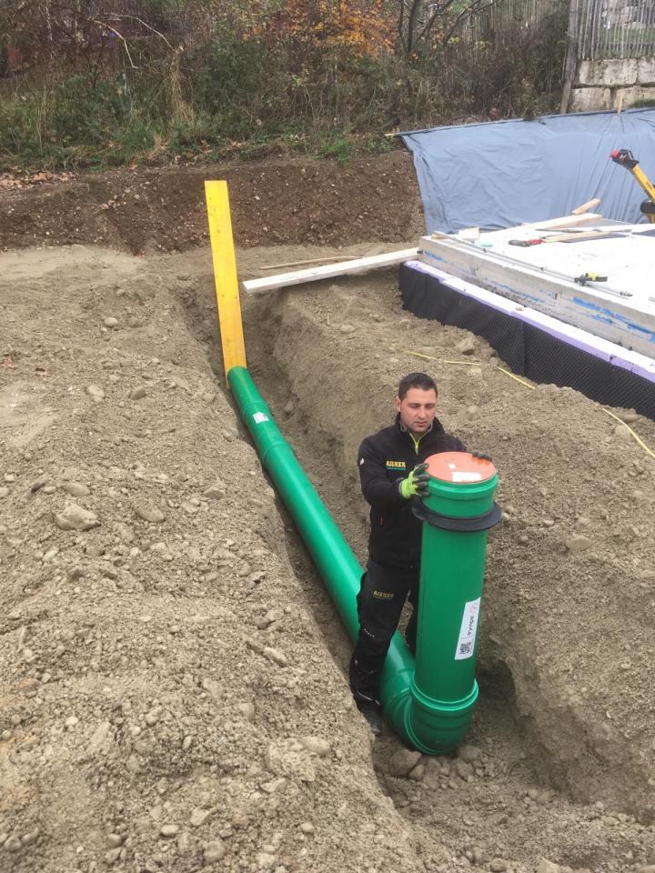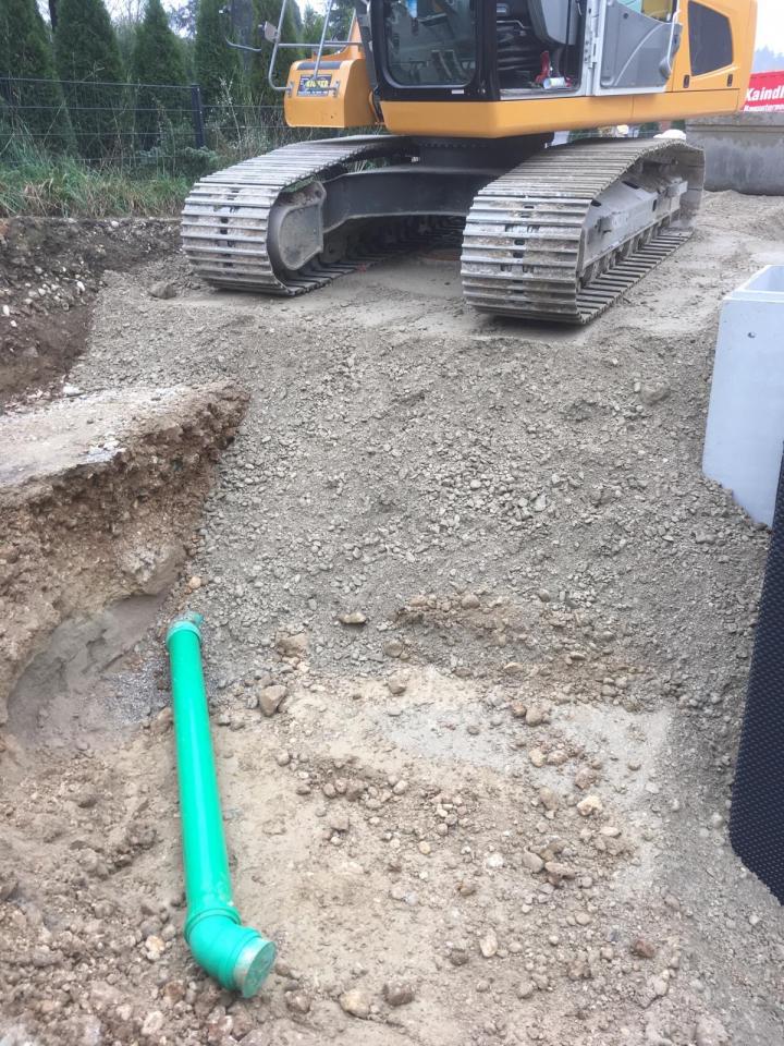 Einbau von Grundleitungen im Bodenplattenbereich inkl. Herstellung der Anschlüsse für Ver. und Entsorgungsleitungen. Der Einbau von 2 Sickerschächten erfolgte ebenfalls
