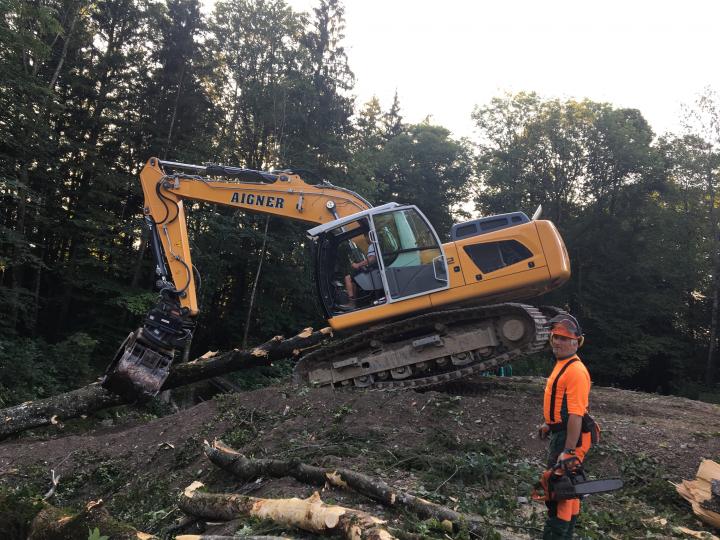 Fällung einiger Randbäume in der Nähe eines Wohngebietes, die gefällten Bäume werden zu Brennholz verarbeitet