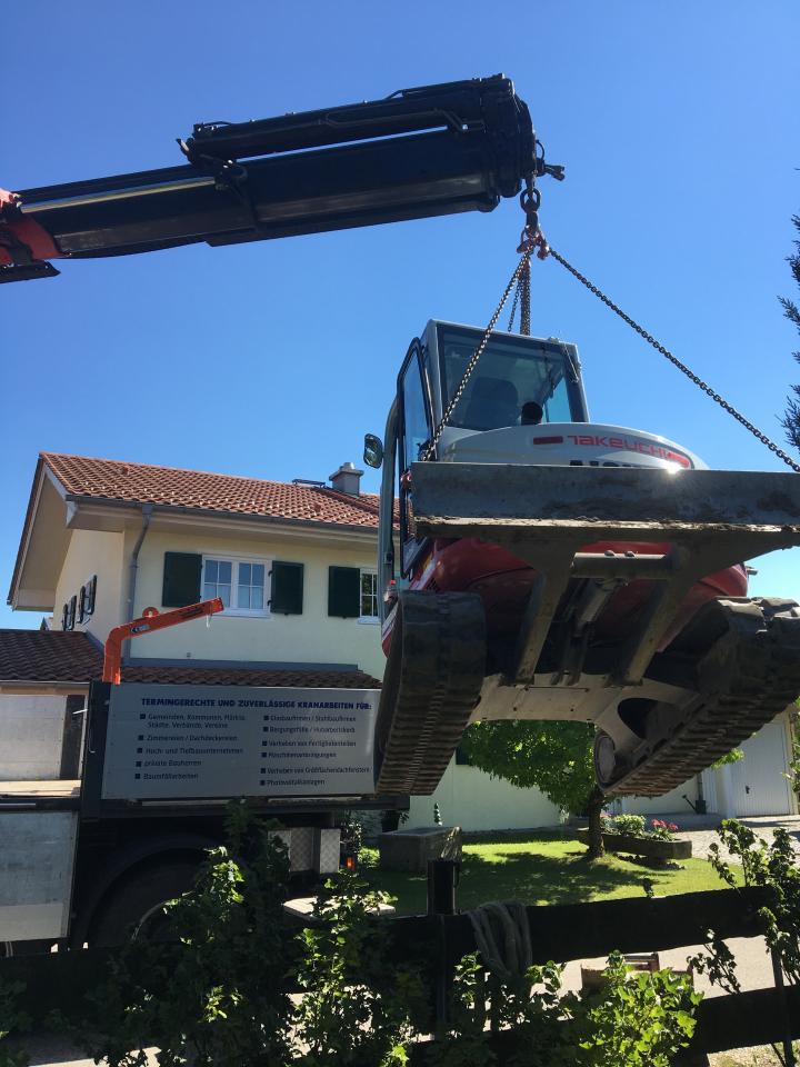Nach Beendigung der Arbeiten haben wir unseren 6,0 to. Bagger mit dem Kran aus der Baustelle rausgehoben