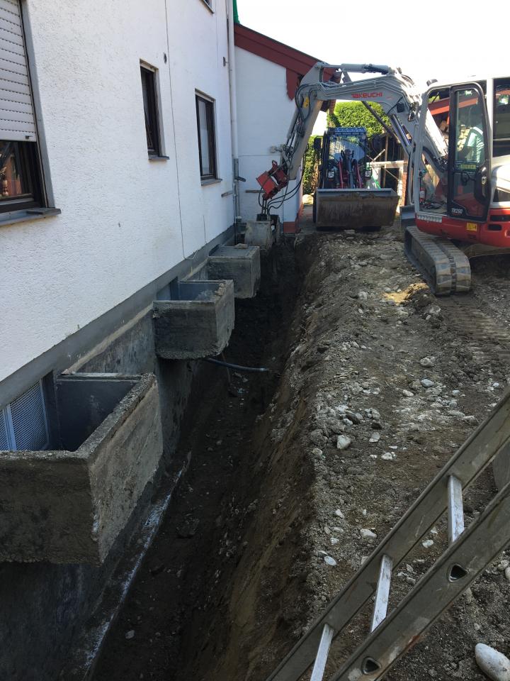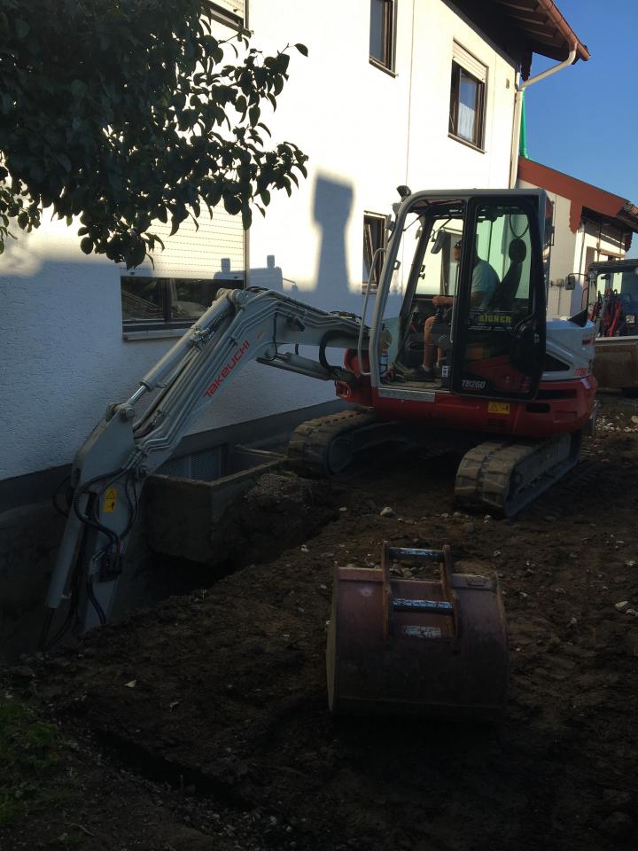 Zur Abdichtung der Kellerwand haben wir diese unter sehr beengten Platzverhältnisse freigelegt, sowie den kompletten Aushub mit dem Kleinradlader aus dem Grundstück transportiert und abgefahren
