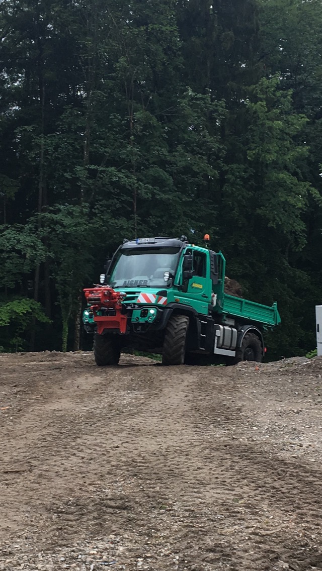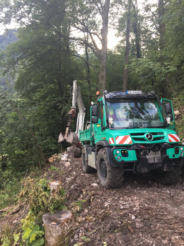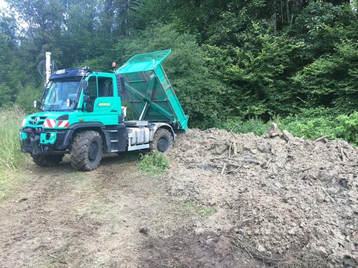 Die Abfuhr des angeschwemmten Materials im steilen Gelände ist nur mit unserem Unimog möglich