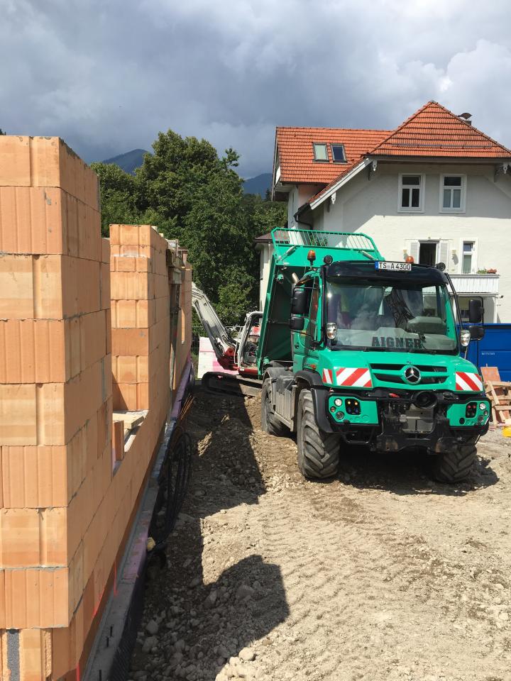 Kiestransport zur Baugrubenverfüllung nur mit unserem Unimog möglich, weil die Zufahrtsstraße sehr beengt ist