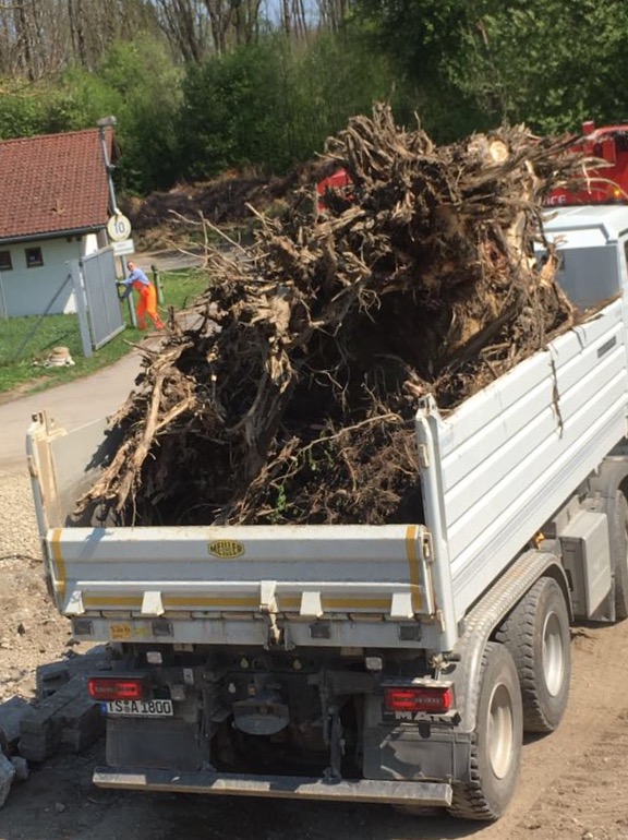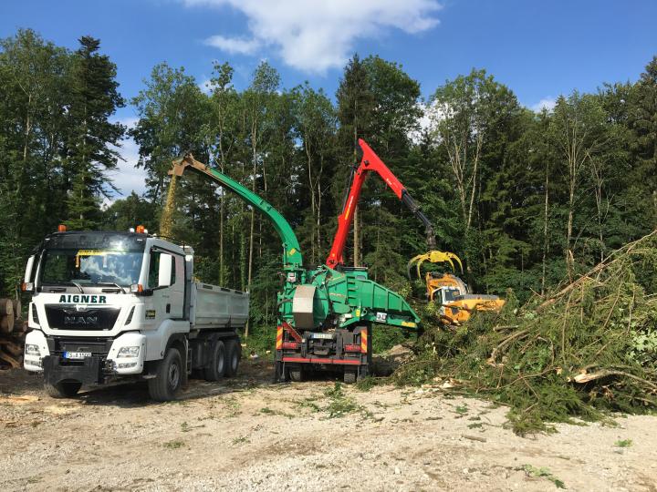 Mit dem Einsatz des Mobilhackers der Fa. Sepp Irlacher Schleching, konnte das Astwerk gleich gehäckselt und dem Biomassehof Achental zugeführt werden