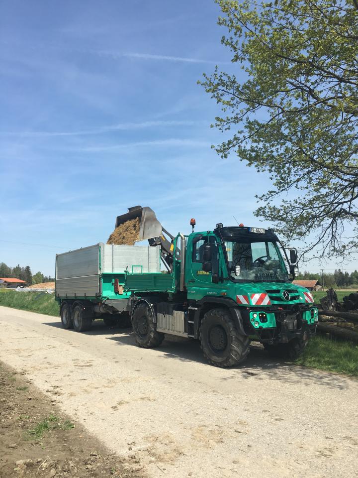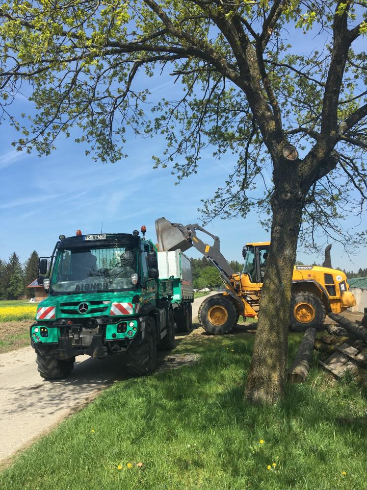 Kiestransport mit Lkw, Unimog und Radlader für einen Wanderweg