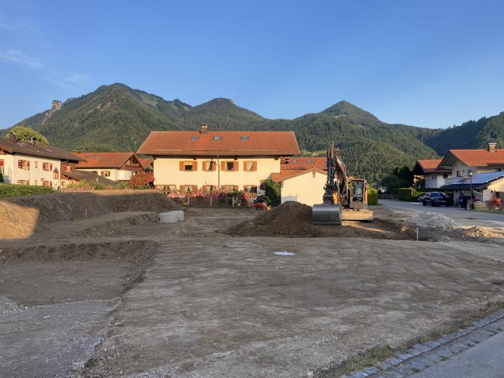 Erdaushub, Erstellung des Frostsicheren Kiesunterbaues sowie Einbau sämtlicher Grundleitungen für ein Doppelhaus in Marquartstein