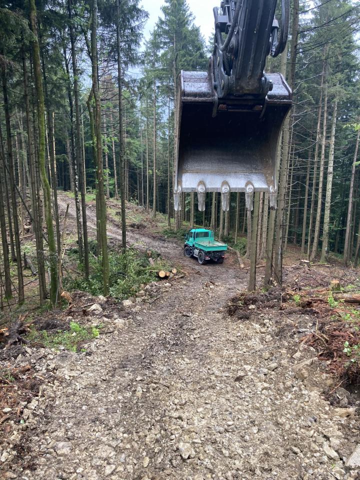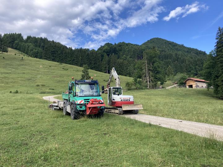 Baggertransport auf die Rachlalm zur Stromkabelverlegung