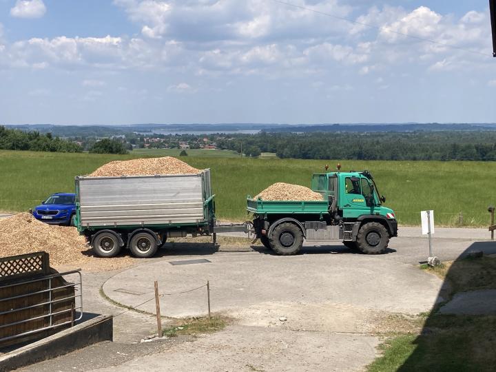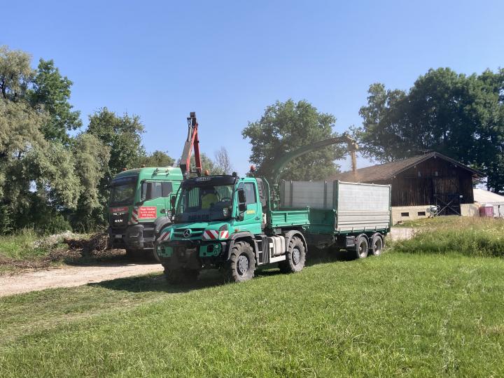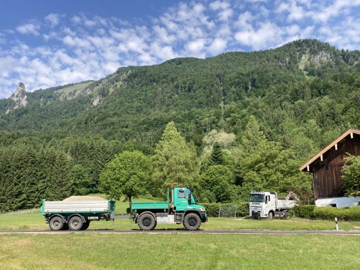 Mit unserem Unimog erfolgt der Kiestransport vom Zwischenlager 1 zum Verladeplatz