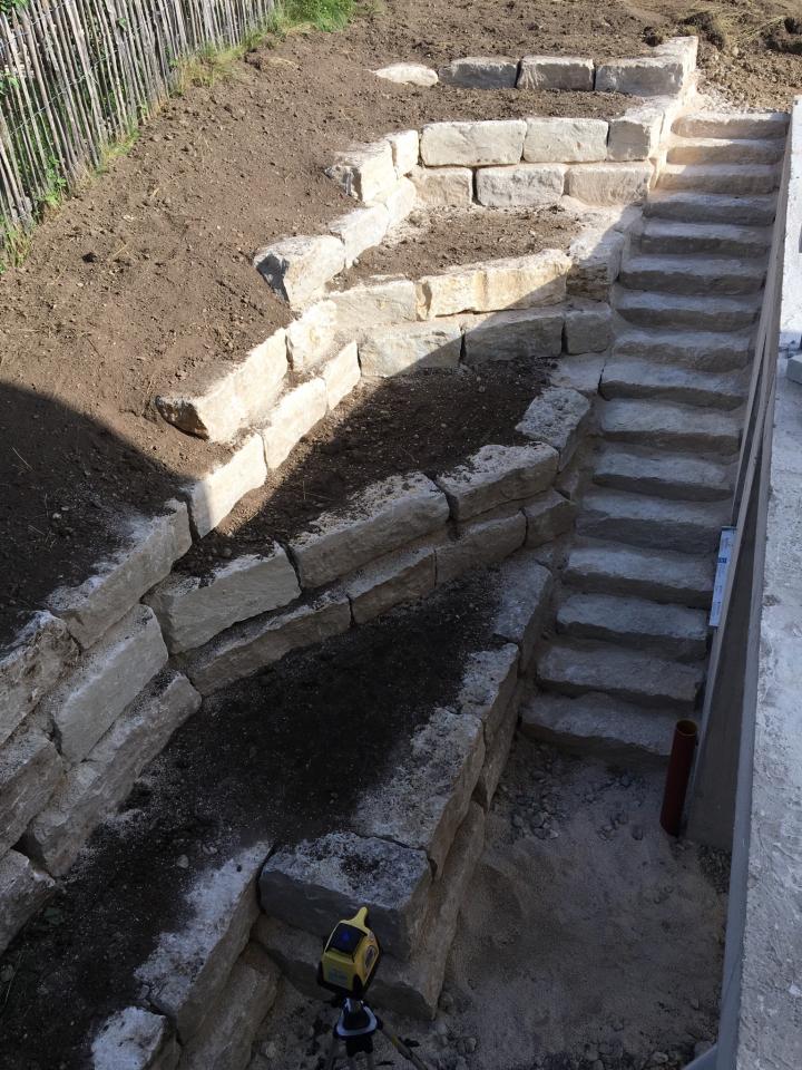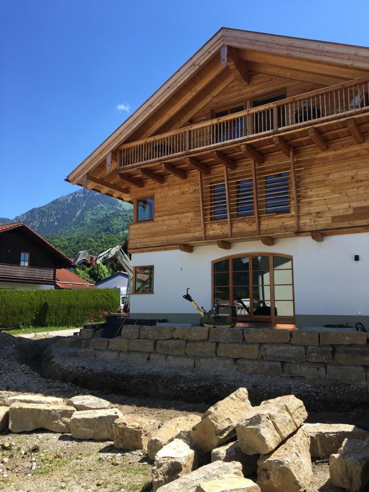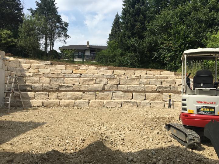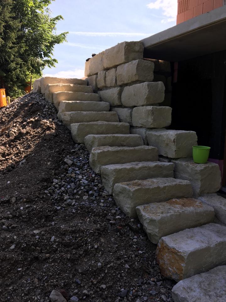 Erstellung von Stützmauerwerk mit Muschelkalk- Quadersteinen in Unterwössen