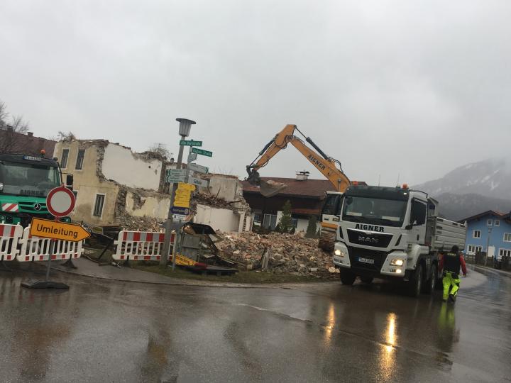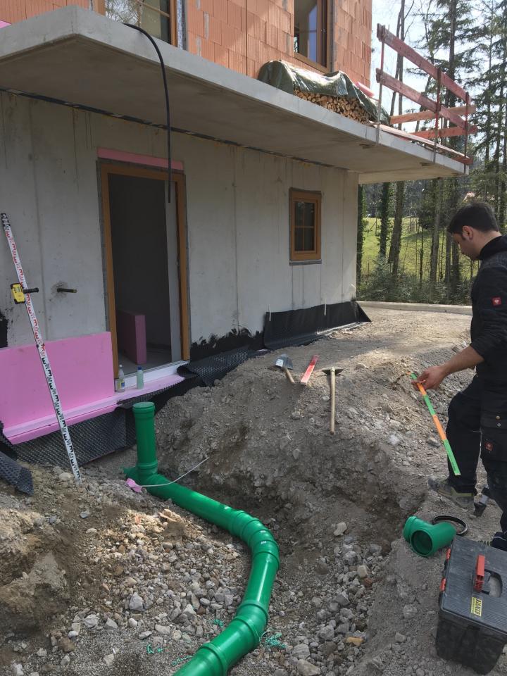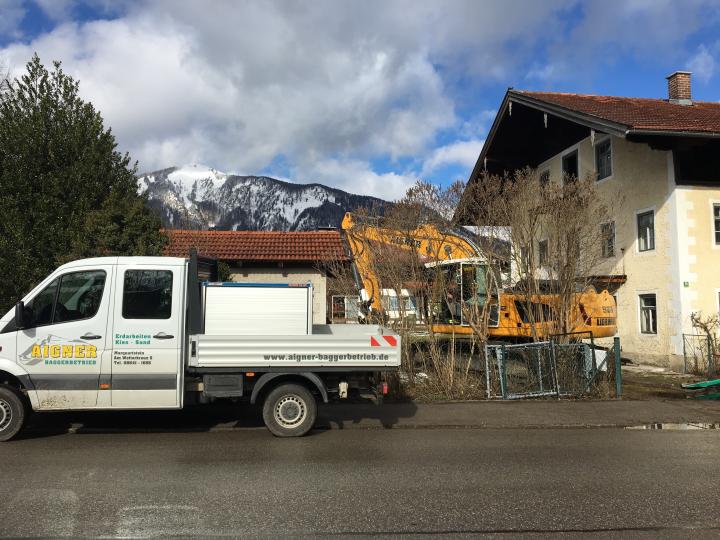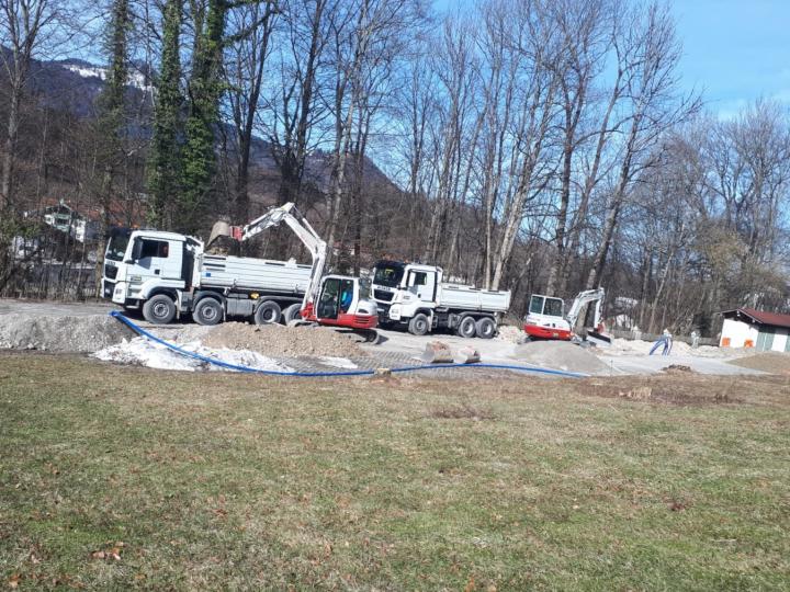 Da uns nur das schmale Zeitfenster der Faschingsferien zur Verfügung stand, mussten wir mit 2 Bagger und 2 LKW anrücken um die Bestehende Wasserleitung für den Turnhallenneubau am Gymnasium in Marquartstein umzulegen