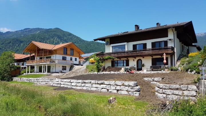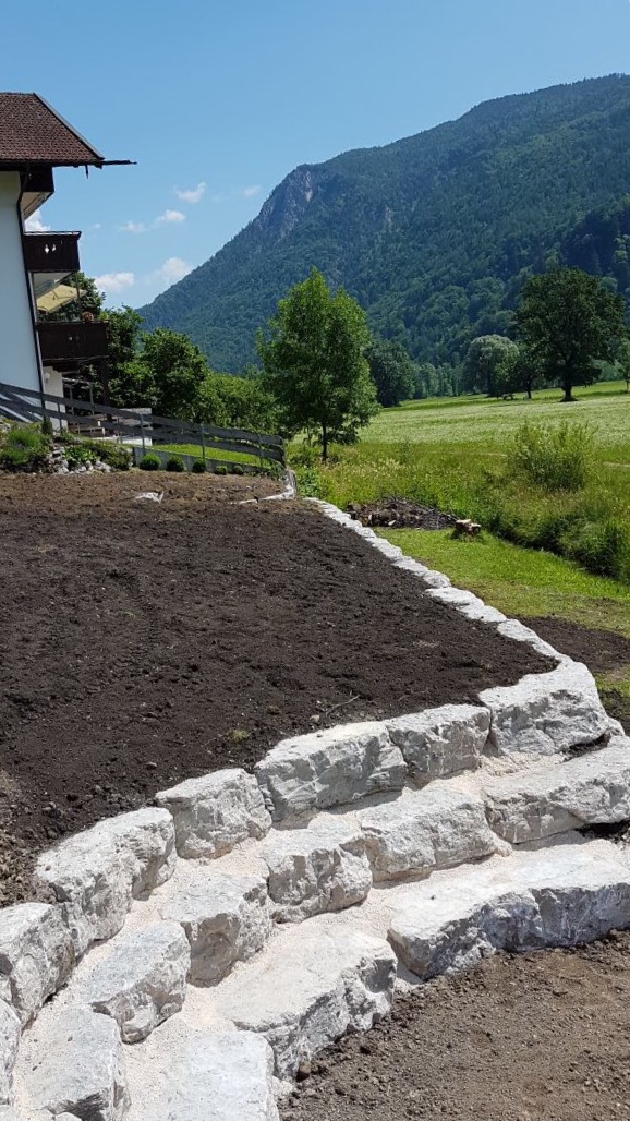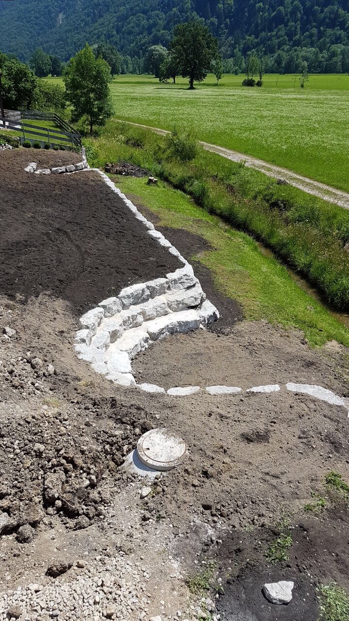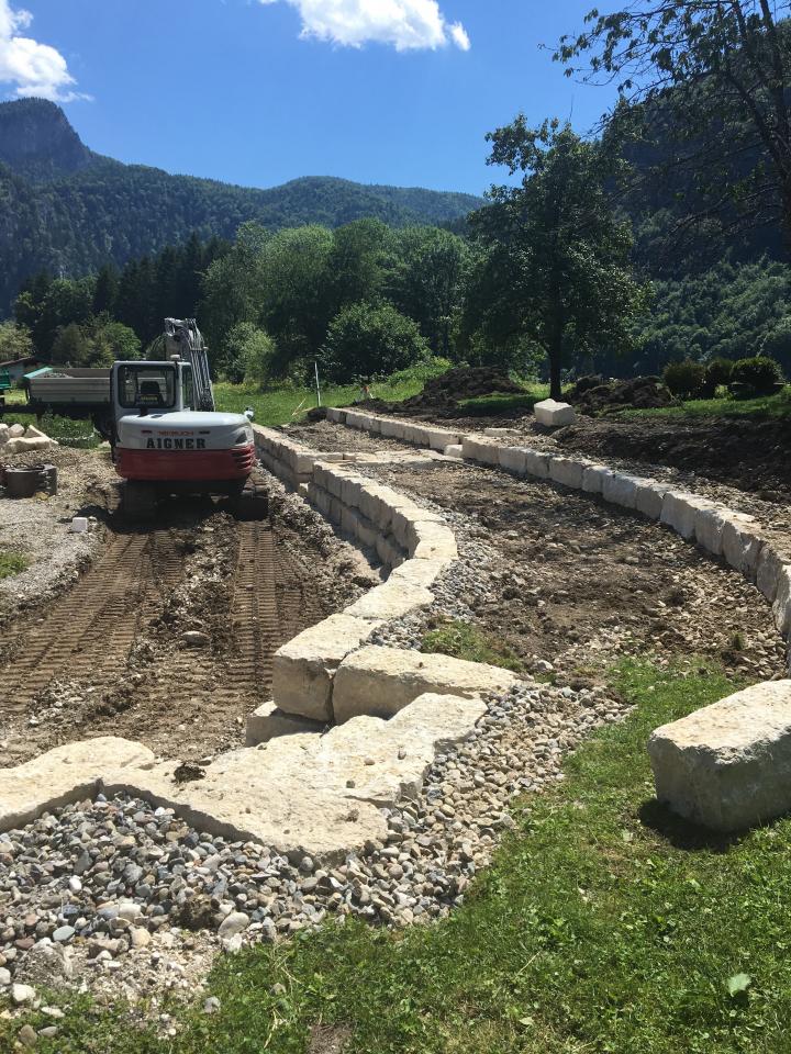 Errichtung einer Stützmauer auf die Gesamte Länge zweier Grundstücke mit Grillplatz und Abfahrtsrampe in Schleching