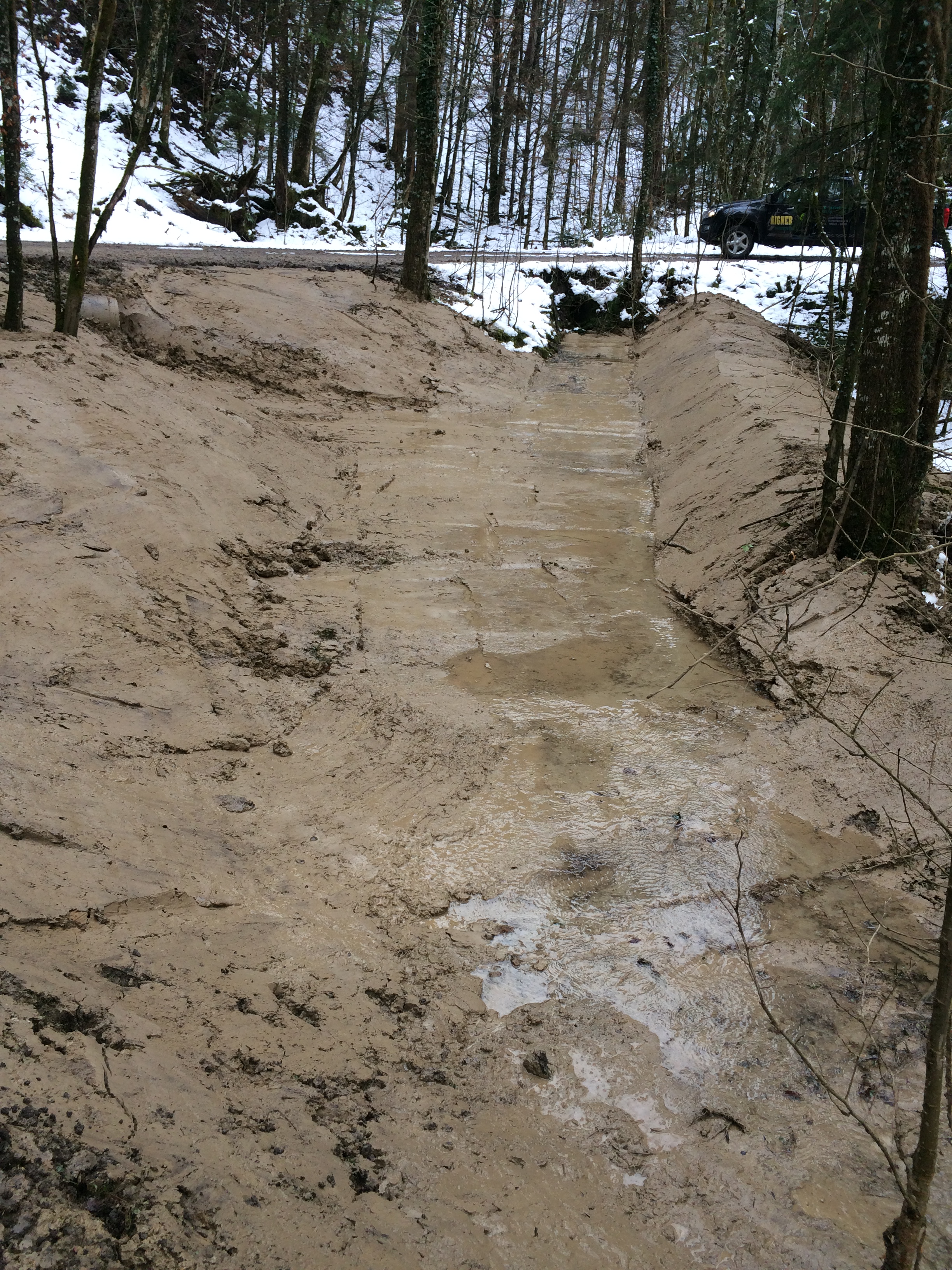 Seitlichen Zulauf zum Tennbodenbach im Ortsteil Niedernfels in der Gemeinde Marquartstein mit Lehmaushub abgedichtet