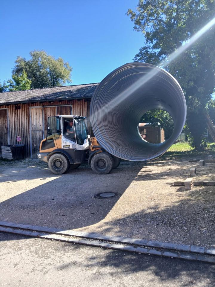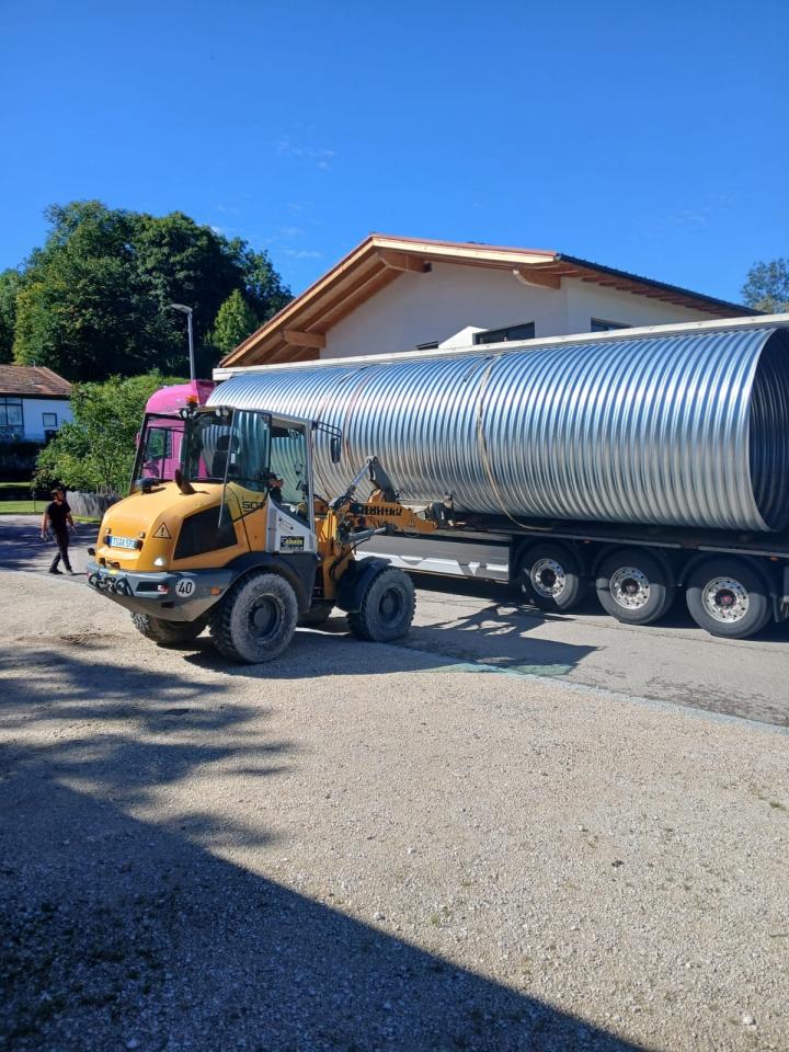 Wellrohr- Durchlassrohr mit einer Baulänge von 10m für den Forstwegebau abgeladen
