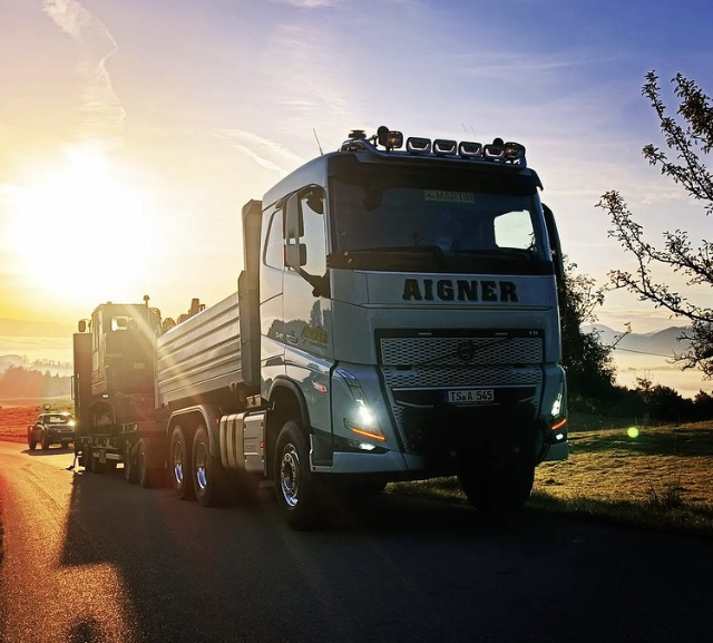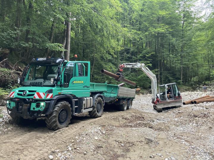 Transport von Stahlrohren für eine Turbinenleitung in Staudach